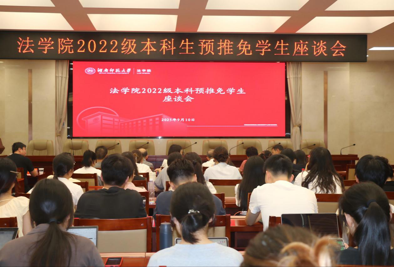 (通讯员 宋垚 刘梦帆)9月10日下午,我院在景德楼北栋205多功能报告厅召开2022级本科生预推免学生座谈会。全国人大代表、政府管理法治研究所学位点负责人肖北庚,副院长、国际法研究所学位点何燕华,环境法研究所学位点负责人李爱年,民法研究所学位点负责人郑远民,法学理论研究所学位点负责人喻名峰,经济法所学位点负责人张德峰,法律文化研究所系主任于熠,程序法所系主任吴彬彬,刑法所教师姜娇,院教务办主任阎英,院研究生办主任王丹,2022级本科生辅导员廖星,2023级本科生辅导员张宁莎出席此次会议。会议由我院党委副书记曹俊峰主持。