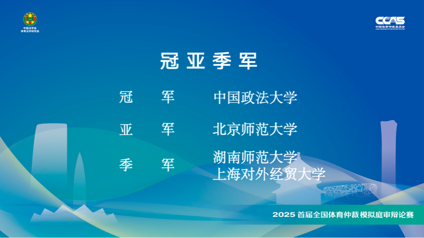 在深圳举办的“首届全国体育仲裁模拟庭审辩论赛”中,由我院学子组成的代表队与来自全国各地的强劲对手同台竞技。比赛中,队员们凭借扎实的专业知识、缜密的法律逻辑、敏捷的思辨能力和出色的临场发挥,经过多轮激烈角逐,最终入围四强,斩获全国季军。此项赛事由中国法学会体育法学研究会与中国体育仲裁委员会联合主办、国家体育总局体育仲裁中心承办、深圳国际仲裁院提供支持,是国内体育仲裁领域的高水平模拟法庭竞赛,我院学子的优异表现,不仅为学校赢得了荣誉,也彰显了他们在体育法学与争端解决实务领域的过硬素养。