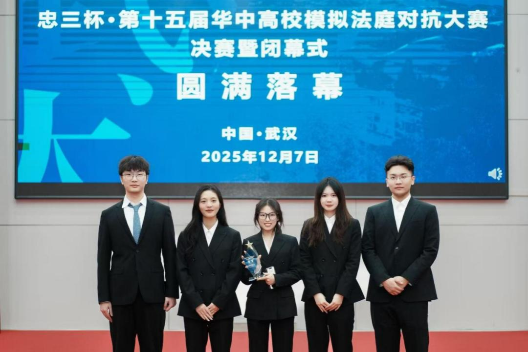 (通讯员 于是 解靖)12月7日,忠三杯·第十五届华中高校模拟法庭对抗大赛决赛暨闭幕式在武汉大学法学院举行。由2024级研究生于是、刘家豪、寻雅玲、陈怡、李文静组成的我院研究生代表队凭借出色的表现,荣获大赛季军。我院教授黄捷担任团队指导老师,我院副教授黄文旭代表我校担任本次比赛初赛书状评审。