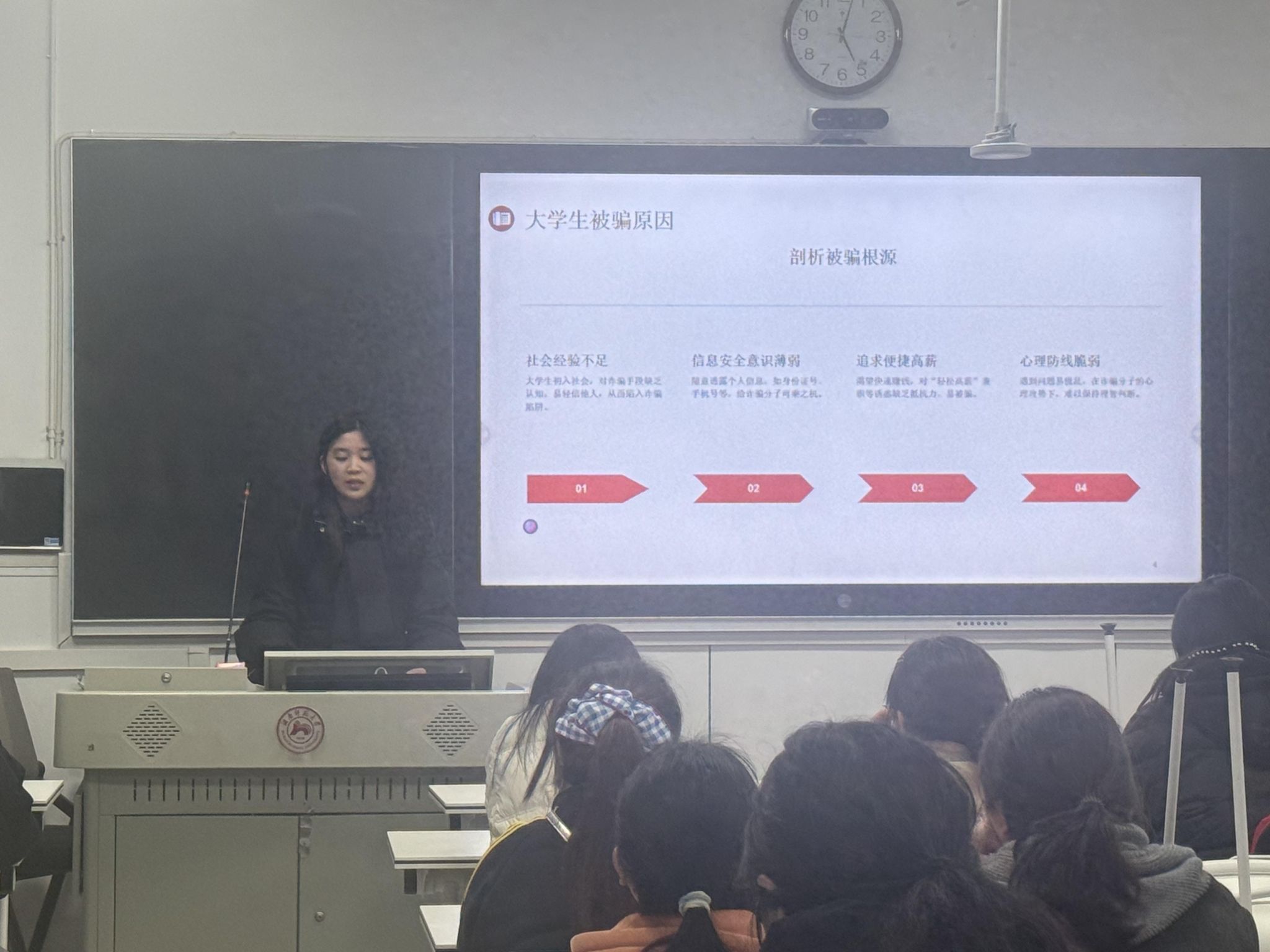 活动伊始,胡子玲同学结合真实典型案例,细致拆解兼职刷单、冒充客服、网络贷款等大学生高频诈骗套路,深入剖析青年学生易受骗的核心原因,并梳理出简洁好记的防骗口诀,让晦涩的反诈知识变得通俗易懂、便于掌握。随后,苏昱舟同学聚焦受骗后的应急处置环节,重点讲解固定证据、联系银行冻结账户、及时报警、修改账户密码等实操步骤,助力大家最大限度降低财产损失。现场互动环节氛围热烈,同学们踊跃提问、主动分享身边见闻,进一步加深了对反诈知识的理解与吸收。