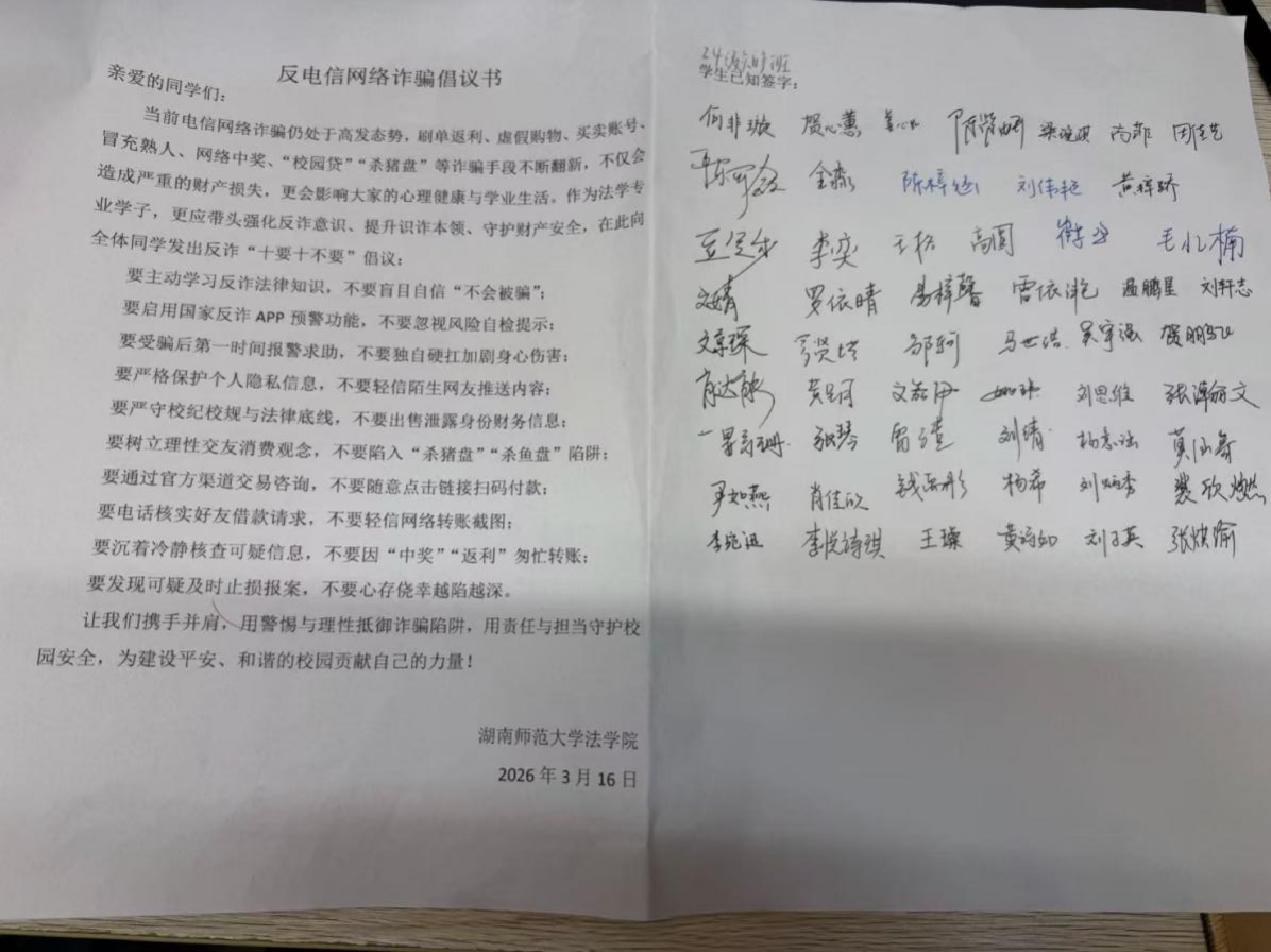 (通讯员 李佳谕)为深入推进“无诈校园”建设,切实提升本科生识诈、防诈、反诈意识与实操能力,筑牢校园安全防护网,3 月 17 日至 20 日,法学院各年级辅导员分批次组织所辖班级召开反诈主题班会,全体本科生参与本次活动。