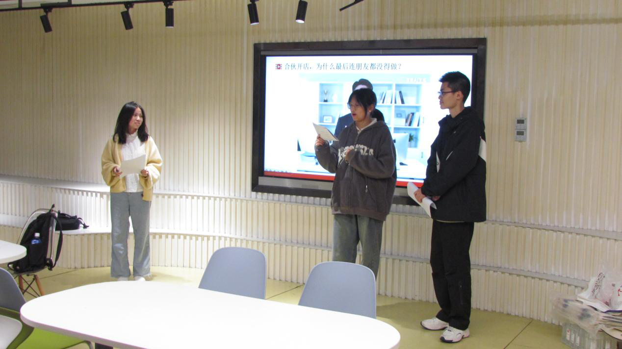 为保障活动顺利落地,团队提前完成多环节筹备工作。队员们明确分工、高效配合:队长组刘昀琛和案件组组长李芬芳负责统筹活动全流程、完成嘉宾对接工作;队员刘梦帆整合活动策划案并参与对接;队员倪莹吉、莫涵睿、王龙威担任分享嘉宾,围绕新《公司法》相关内容,为现场初创团队讲解创业初期常见法律问题及应对思路。