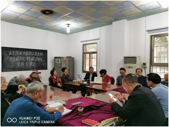 (通讯员 王宇潇)9月25日上午,在国庆和中秋佳节到来之际,法学院于烽书记、耿自强副院长一行赶赴张公岭校区慰问退休老同志,并参加了学院退休教职工党支部“严守政治纪律和政治规矩”专题生活会,在老干部活动中心举行退休老同志座谈会。会议由离退休支部党支部书记郑来诚主持。