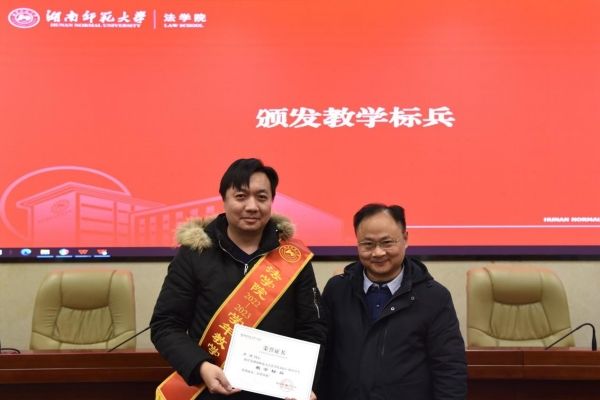 会上,陈胜国宣读了2022—2023学年度学院教学标兵、科研标兵表彰决定,授予倪洪涛、张德峰“科研标兵”称号,并由唐建文、欧福永颁发荣誉证书,授予于熠“教学标兵”称号,并由周刚志颁发荣誉证书。他希望受表彰同志再接再厉、不断进取,争取取得更大成绩,为法学院科研工作做出新的贡献。