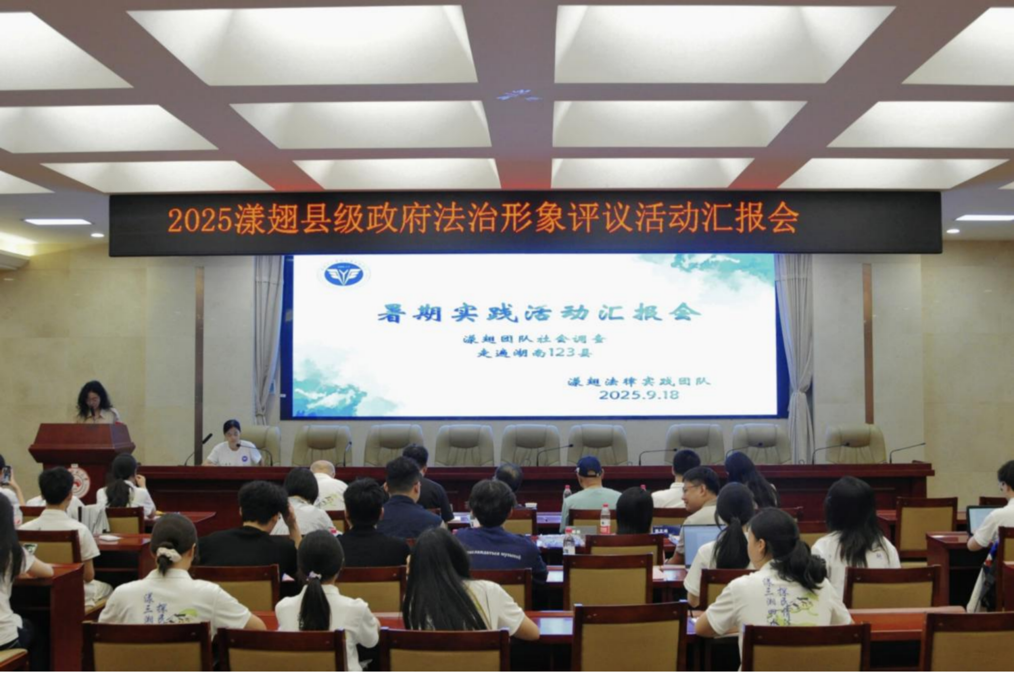 (通讯员 白欣睿 刘睿珩)9月18日下午,漾翅法律实践团队湖南省县级人民政府法治形象民主评议暨反诈、禁毒暑期实践活动总结会在法学院205多功能报告厅举行。法学院党建组织员唐建文,院党委副书记曹俊峰,湖南省法学会程序法学研究会会长、法学院教授黄捷,民主与法制社湖南记者站站长马付才,五湖律师事务所主任郑宇敦,五湖律师事务所管委会主任蔡鹃,五湖律师事务所合伙人、漾翅团队第一任队长孟海燕,漾翅暑期调研活动指导老师吴彬彬、蒋文峰,法学院研究生、漾翅第十二届队长助理赵传旭出席会议,实践团队全体队员共同参加会议。