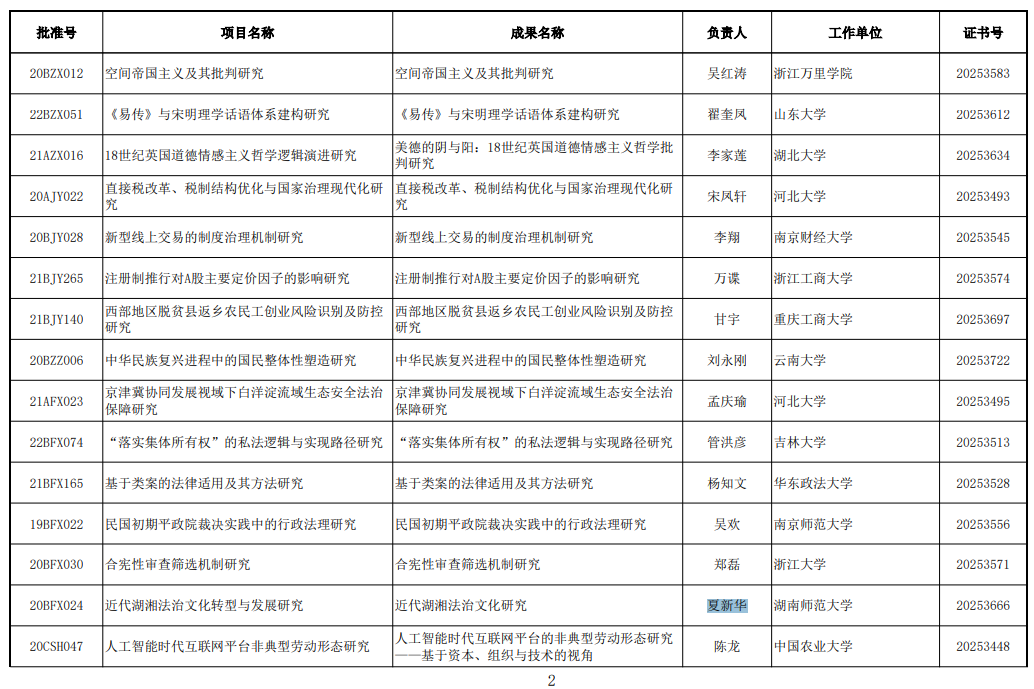 近日,全国哲学社会科学工作办公室公布的年度项目结项名单中,我院夏新华教授国家社科基金项目研究成果《近代湖湘法治文化》被同行专家鉴定为“优秀”等级。