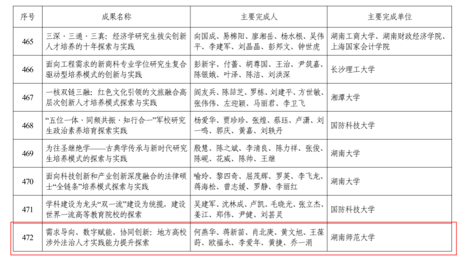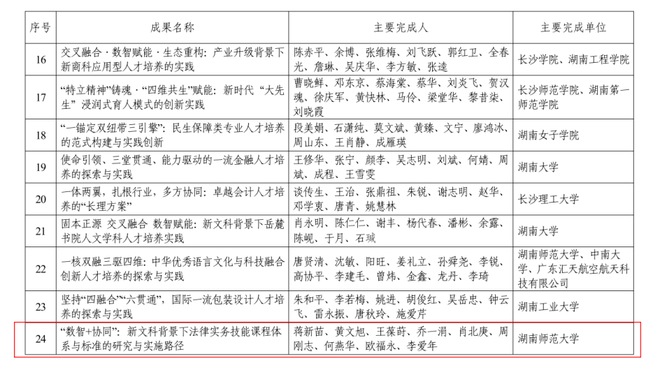 (通讯员 韩蕴恬)近日,湖南省教育厅公布2025年湖南省高等教育教学成果奖获奖名单,我院蒋新苗教授团队成果《“数智+协同”:新文科背景下法律实务技能课程体系与标准的研究与实施路径》获评省级特等奖,何燕华副教授团队成果《需求导向、数字赋能、协同创新:地方高校涉外法治人才实践能力提升探索》获评省级二等奖,充分彰显我院在法学教育教学改革与卓越法治人才培养领域的深厚积淀与突出成效。
