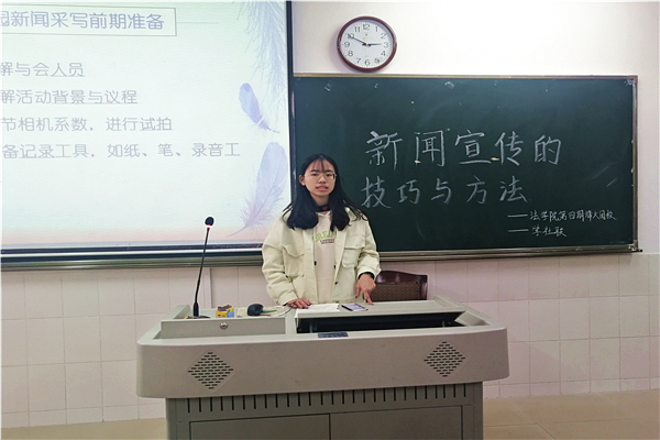 杨雅慧从新闻概述、校园新闻采写、新闻写作和新闻照片拍摄四个部分入手,向学员们讲述了新闻稿件的制作投递流程以及如何提高新闻宣传的质量和效率。她着重向学员们讲解了新闻内容的写作与照片的拍摄要求和技巧,并结合以往工作经验,分别从新闻标题、导语、主体和结语四个方面提出了在写作过程中经常出现的问题以及需要注意的细节。同时,她强调了照片拍摄时需要注意角度、人物神态和清晰度等问题。她指出,每一个社团或系统都会举办各种活动和比赛,新闻宣传工作尤为重要,掌握新闻制作的方法和技巧能够有效提高稿件的质量和过稿率,推动我院日常活动和新闻得到更好的宣传。
