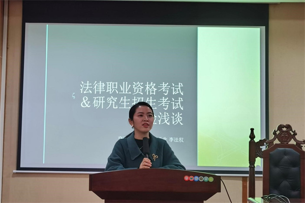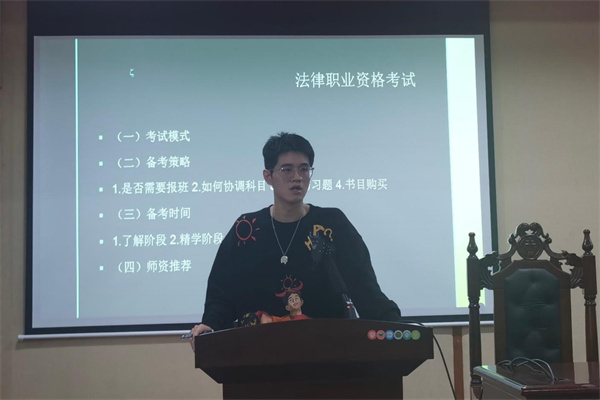 此次交流会邀请了我院2016级李法权,2017级曹颖、陈露、许华燕等四位优秀学生代表传授备考经验。他们结合自身经历,就法考和考研的准备计划、复习方法、课程选择等方面进行了详细的介绍。曹颖具体分享了法考和考研的备战计划,建议备考时利用树形图的方式便于构建知识体系。陈露分享了法考心得,提醒各位同学明确目标制定计划的同时要注意调整心理状态,保持良好生活规律。许华燕结合具体的经历分析了法考报班的利与弊并分享了具体的备考规划。李法权表示法考相较考研来说更为重要,提出法考是淘汰赛,考研是晋级赛的观点,介绍了法考、考研的考试题型与考取情况并对当下热门线上课进行具体的分析。