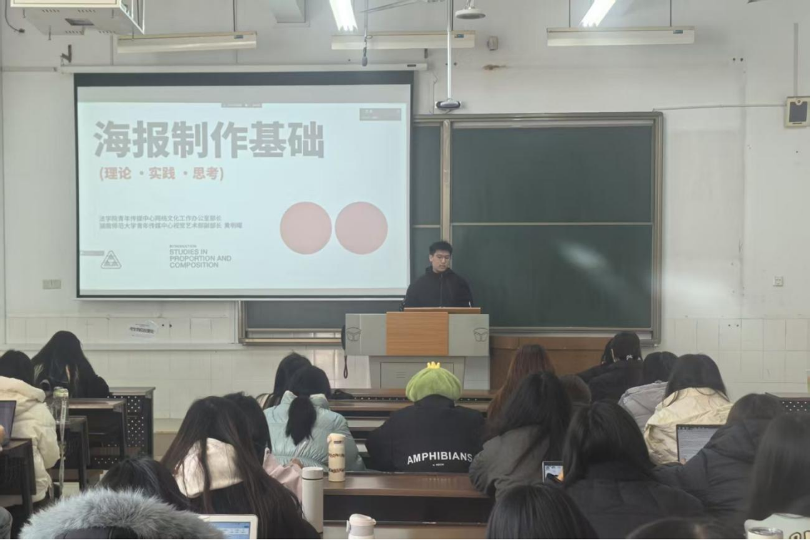 (通讯员 刘睿珩 黄心怡)11月21日中午,我院第十期烽火团校技能培训班在二里半校区景德楼南栋202教室与桃花坪校区实训楼201教室,通过线上线下相结合的方式同步开展“海报制作”专题课程。课程由院青年传媒中心黄明曜主讲,院团委发展部干事黄心怡主持,旨在帮助同学们掌握海报制作的相关技巧,提升构图和使用字体的能力。